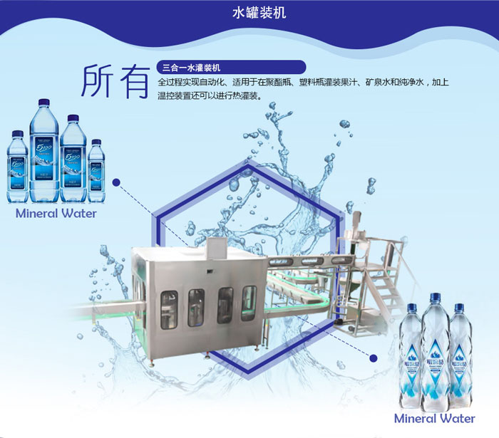 飲用水灌裝機集沖洗、灌裝、旋蓋于一體,全過程自動化運行,主要適用礦泉水、純凈水等不含氣飲料的沖瓶、灌裝、封口連續作業。本機大部分電器系統零件均采用國外優良產品,所有與液料接觸的地方均采用優質的不銹鋼材料制作,主關鍵部件采用數控機床精密加工, 整機光電檢測各部件的運行狀況,無瓶不灌裝,無瓶不送蓋,自動化程度高,操作簡易,具有耐磨、穩定、故障率低等特點,產品質量處于行業前列,是新老飲料投資者的較佳選擇。