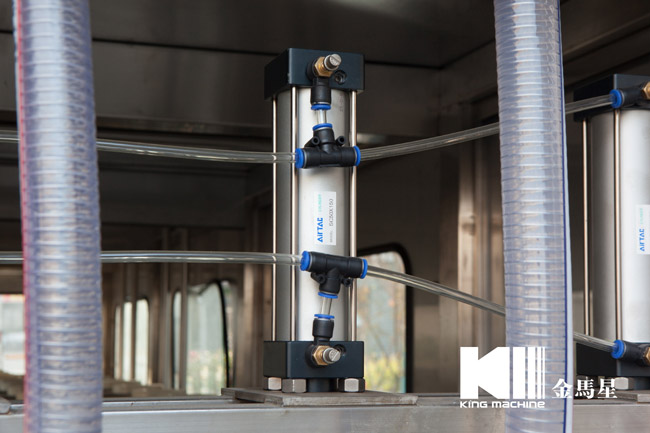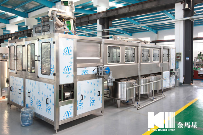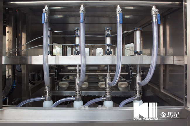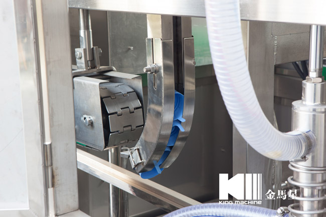 本設備集合了消毒、沖洗、灌裝和壓蓋,合四為一,能夠實現全自動桶裝水旋蓋。沖瓶機使用多種沖品液和消毒液,以保證獲得沖瓶和殺菌效果。消毒液可以循環使用,節省消耗。