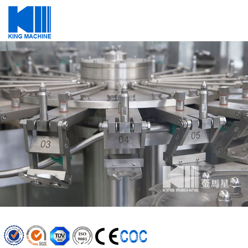本機主要用于飲料的灌裝作業。本機將洗瓶、灌裝、封口三功能合在一個機體上,全過程實現自動化、適用于聚酯瓶、塑料瓶灌裝礦泉水、純凈水,加上溫控裝置還可以進行熱灌裝。各部分的適用瓶型調整采用手柄轉動實現,輕松自如,簡便快捷。灌裝方式采用了新型的微壓灌裝,使灌裝速度更快更穩定,所以同規格的機器相比本機的產量更高,效益更大。本機采用了優良的OMRON可編程控制器(PLC)控制機器的自動運行,進瓶鏈道采用變頻器調速,與主機變頻器的調速相互配合使進瓶運行更穩定可靠。光電檢測各部件的運行狀況,所以自動化程度高,操作簡便。在此基礎上,本機變更灌裝部分;可以形成低真空灌裝方式和等壓灌裝方式。低真空灌壓方式(Z型機),適用于玻璃瓶,灌裝酒類、醬油等物料,其封口方式可以選配鋁金屬防盜蓋和塑料蓋。等壓灌裝方式(Y型機)適用于聚酯瓶,塑料瓶灌裝含汽飲料,是飲料生產廠家理想的優選設備。